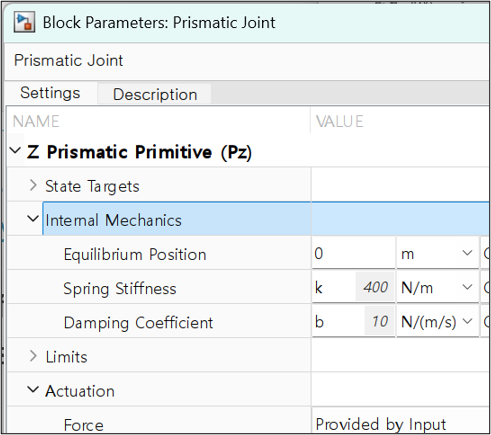 - 스프링과 댐퍼를 Prismatic Joint의 내부 메커니즘으로 모델링