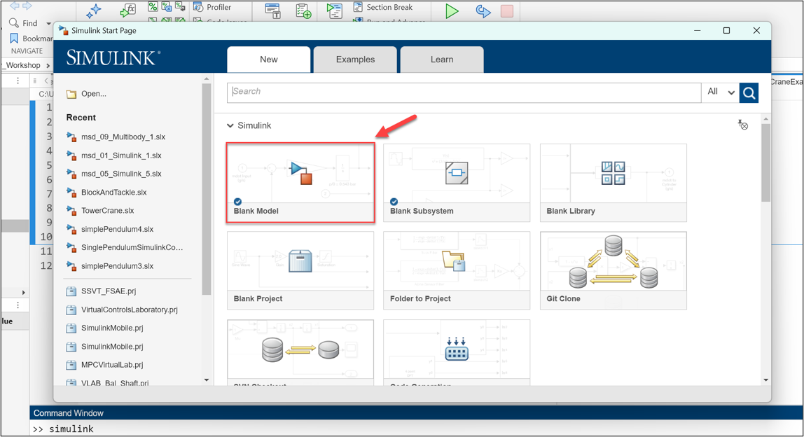우선, 시뮬링크를 실행시키기 위해 MALTAB의 Command Window에서 simulink라고 입력하면 아래 그림과 같은 페이지가 뜬다. 여기서 Blank Model을 열어보자.