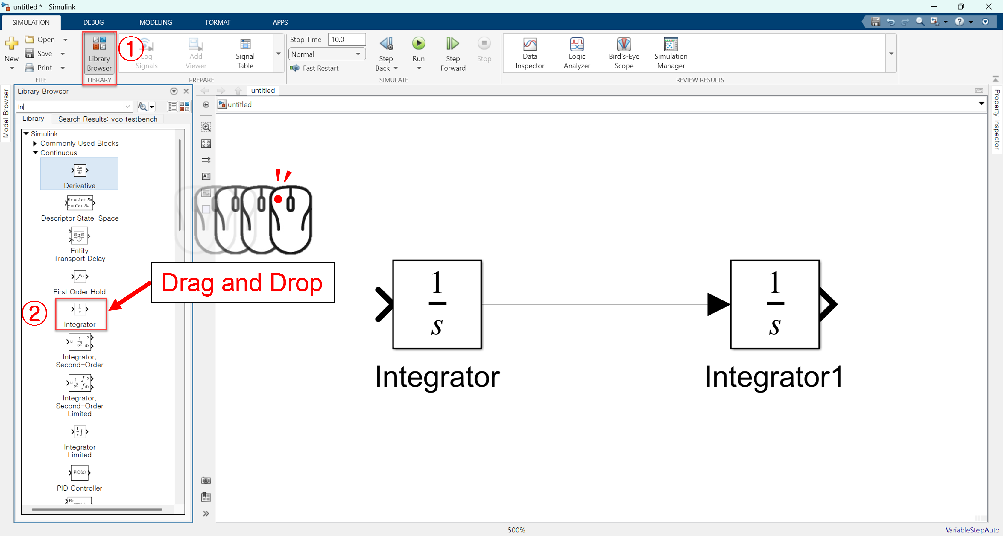 우선, 캔버스에 integrator 블록을 두개 놓고 두 블록 사이를 연결하자.