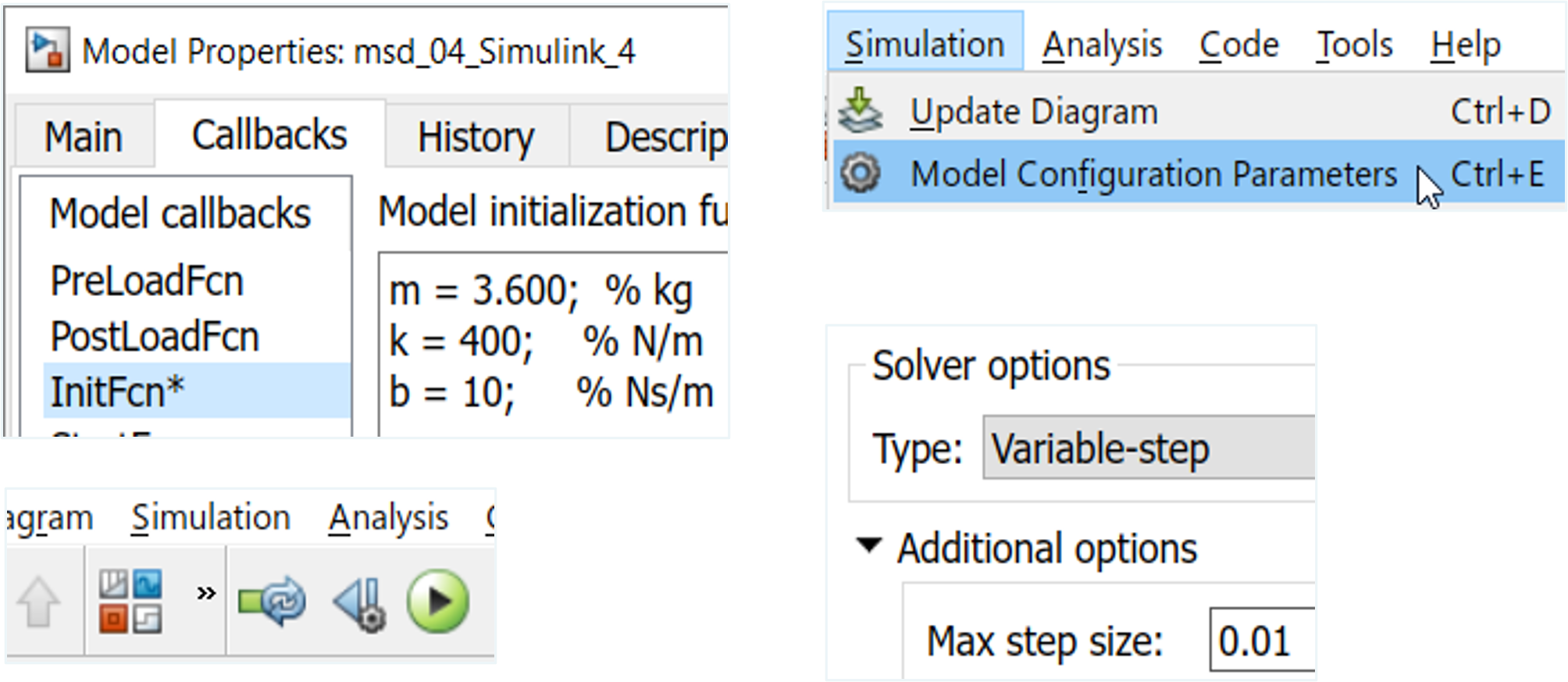 모델 파라미터는 Model Callback (InitFcn) 에서 정의한다. 단축키 Ctrl + H를 눌러 Model Properties를 열면 Callback 탭을 확인할 수 있다. 여기서 InitFcn 콜백을 찾고 m, k, b 값을 차례대로 넣어준다.