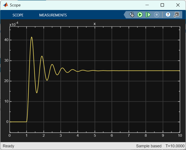 이제 시뮬레이션을 실행해보면 (단축키 F5) Scope에서 아래와 같은 결과물을 얻을 수 있다. 참고로 y축의 값이 10의 -4승 단위로 그려진 것을 알 수 있다. 이것은 입력으로 들어가는 힘은 1초 이후에 10N의 힘이 들어가는데 반해 스프링 계수가 400 N/m나 되므로, 1m를 움직이기 위해서는 400 N의 힘이 필요한 만큼의 강한 스프링이기 때문임을 알 수 있다.