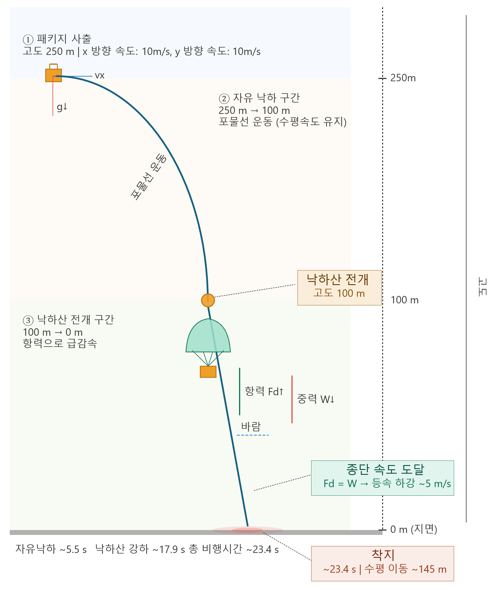 시뮬레이션은 위와 같이 전개된다. 고도 250m에서 x 방향으로 10m/s, y 방향으로 10m/s로 비행하고 있는 물체에서 패키지가 사출된다. 투하 초기, 패키지는 항공기의 비행 속도를 그대로 이어받는다. 낙하산이 펼쳐지기 전까지 패키지는 공기 저항이 거의 없는 ‘포물선 운동’을 하며 관성에 의해 전방으로 나아간다.