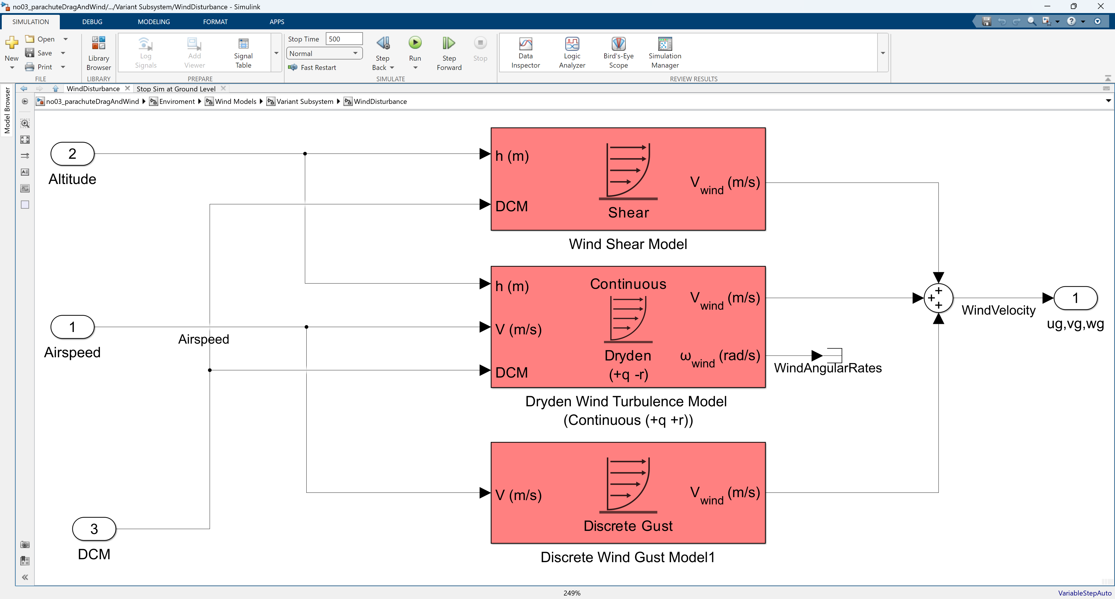 바람의 모델링은 Wind Shear Model, Dryden Wind Turbulence Model (Continous), Discrete Wind Gust Model의 세 가지 블록을 이용해 수행되었다. 이 블록들은 모두 군사 규격에 의거한 것이라고 한다.