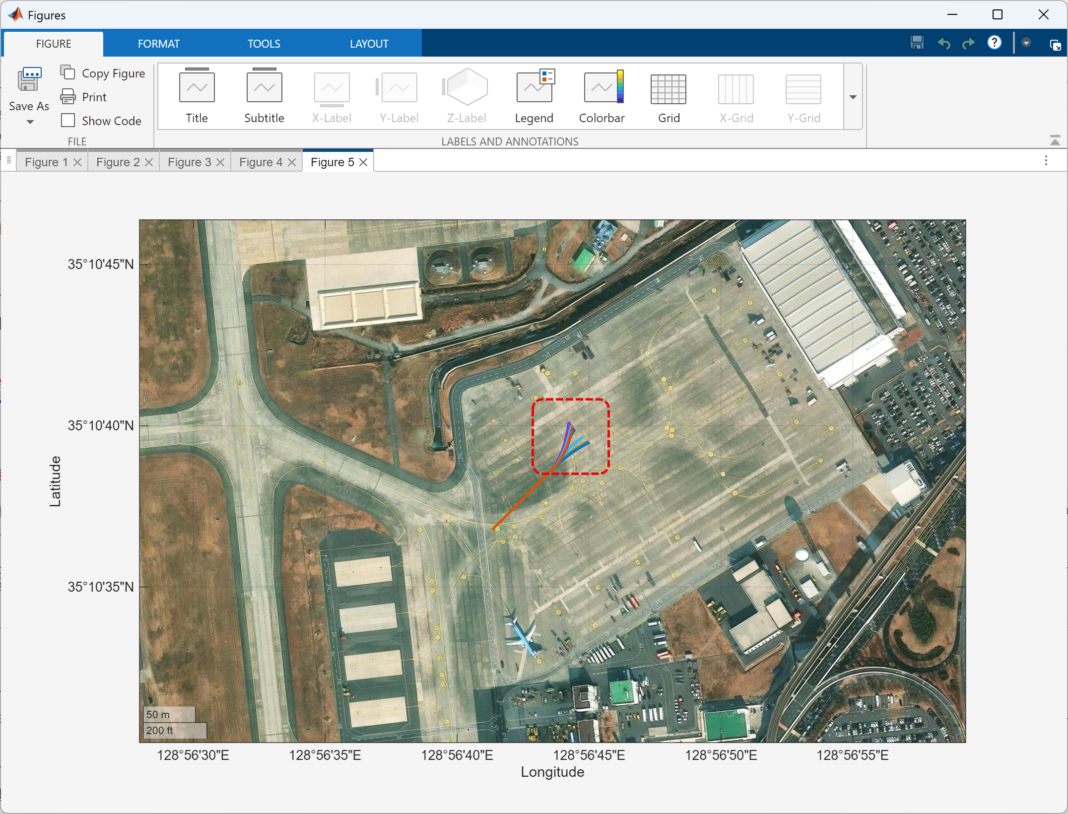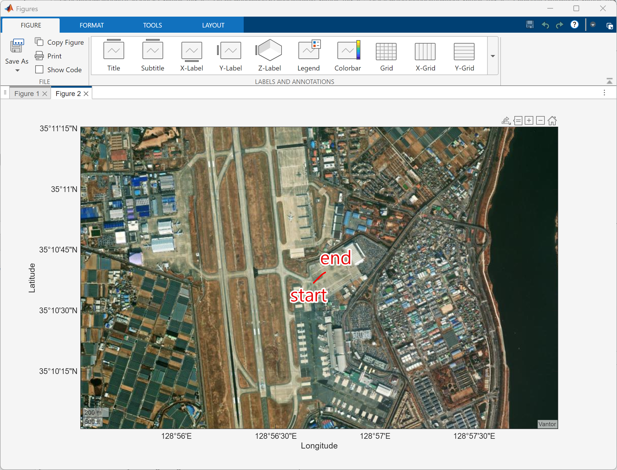 앞선 no03_parachuteDragAndWind.slx 모델의 시뮬레이션의 배경을 위성 지도로 옮겨, 김해공항(latitude: 35.176250, longitude: 128.944814)의 250m 상공에서 자유낙하 및 100m 상공에서 낙하산을 펼치게 된다면 아래와 같이 착륙시킬 수 있다.