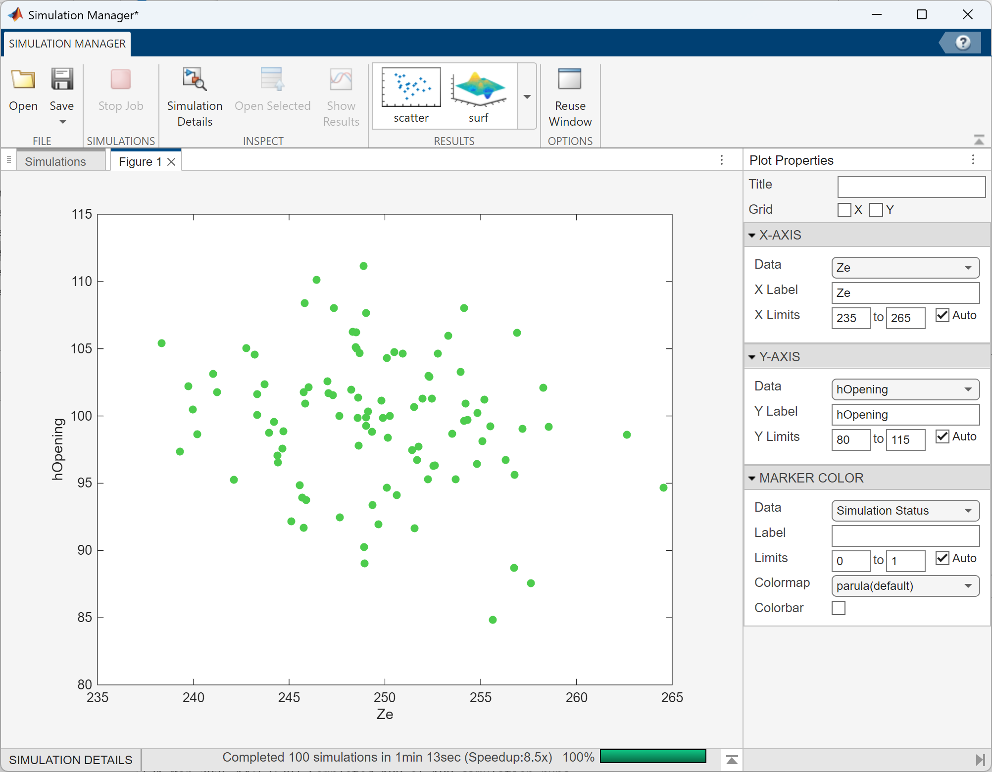parsim 명령어로 병렬 시뮬레이션을 실행하면 아래와 같이 시뮬레이션 매니저 창이 뜨면서 현재 입력으로 넣고 있는 값들을 표시해준다. 총 100회 시뮬레이션을 수행하며 시뮬레이션 매니저에서는 8.5배 속도 향상을 보았다고 한다.