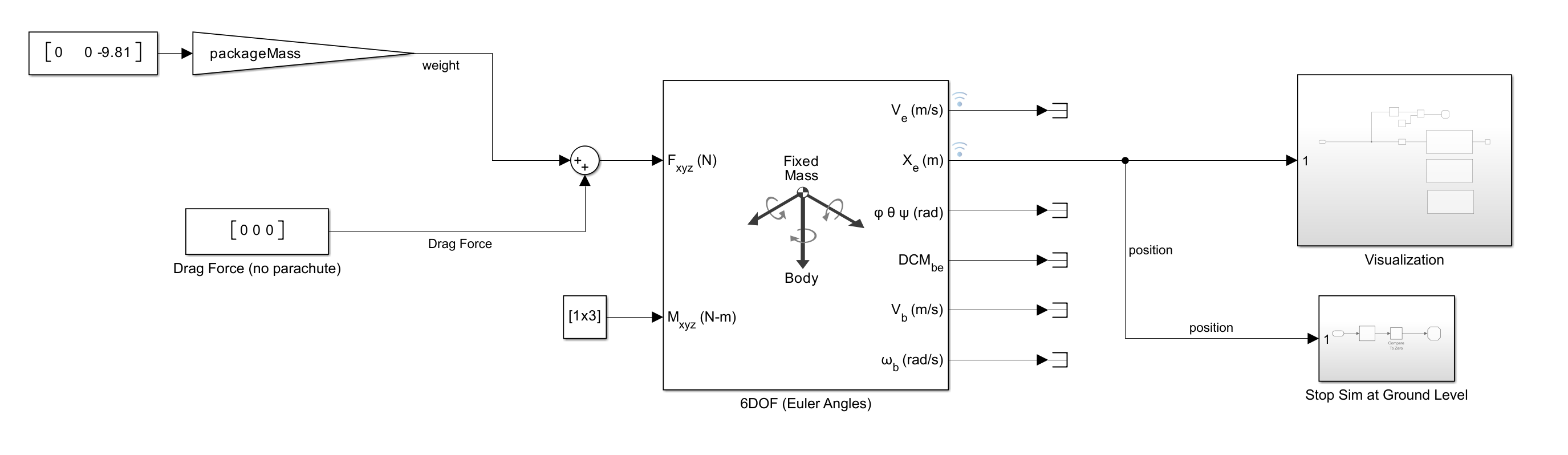 시뮬링크에는 6 자유도 (xyz 방향 힘과 모멘트) 물리 모델링 및 공기 밀도나 바람 등의 환경 모델링을 위한 블록(6DOF (Euler Angles))을 제공한다.