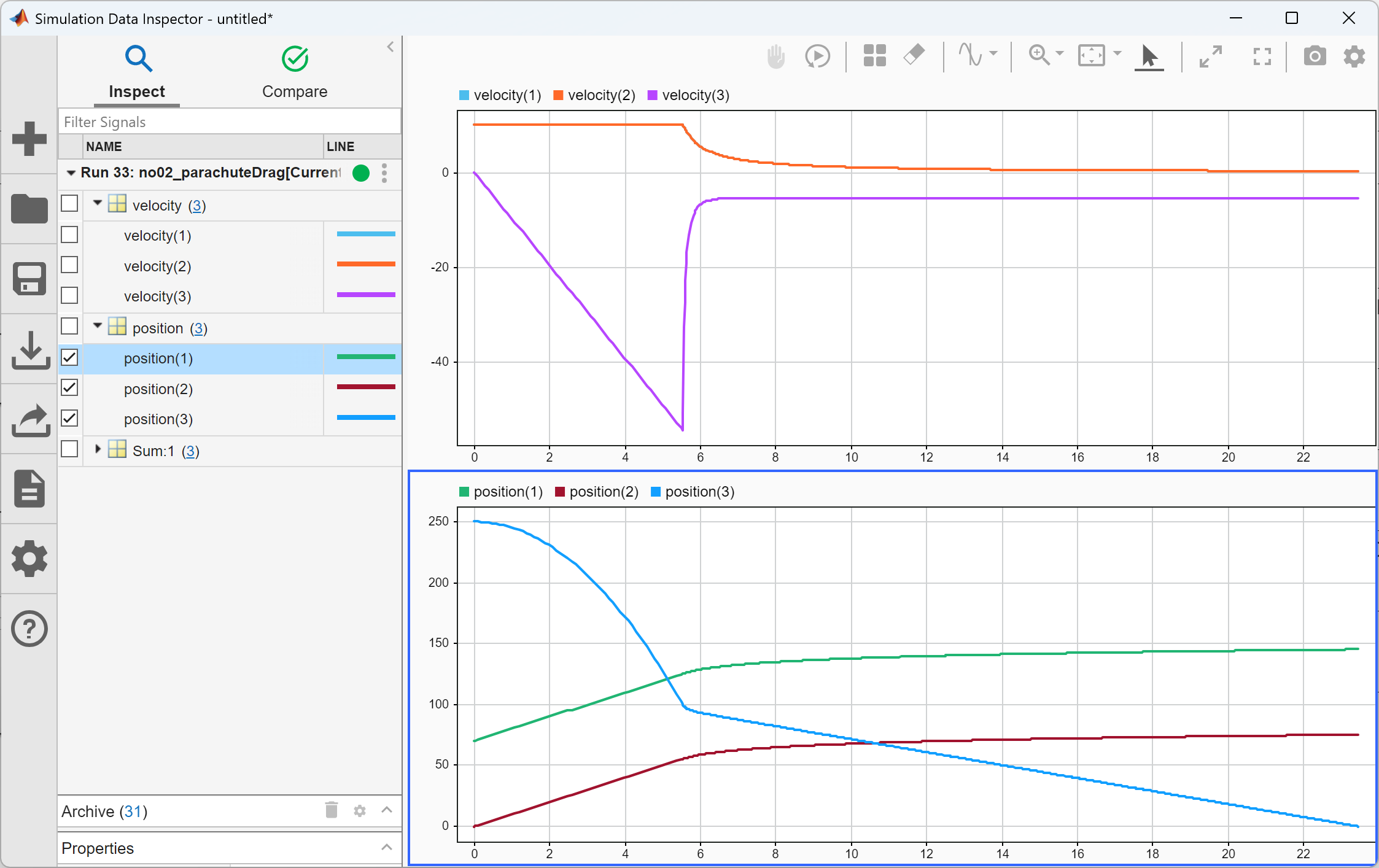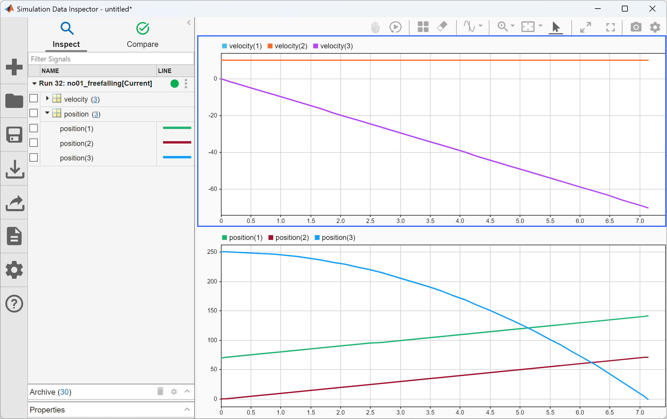 위 그림의 아랫쪽 패널에 있는 position(3) 의 수치를 보면 250m에서 최종 0m까지 포물선을 그리며 떨어지는 것을 알 수 있다.