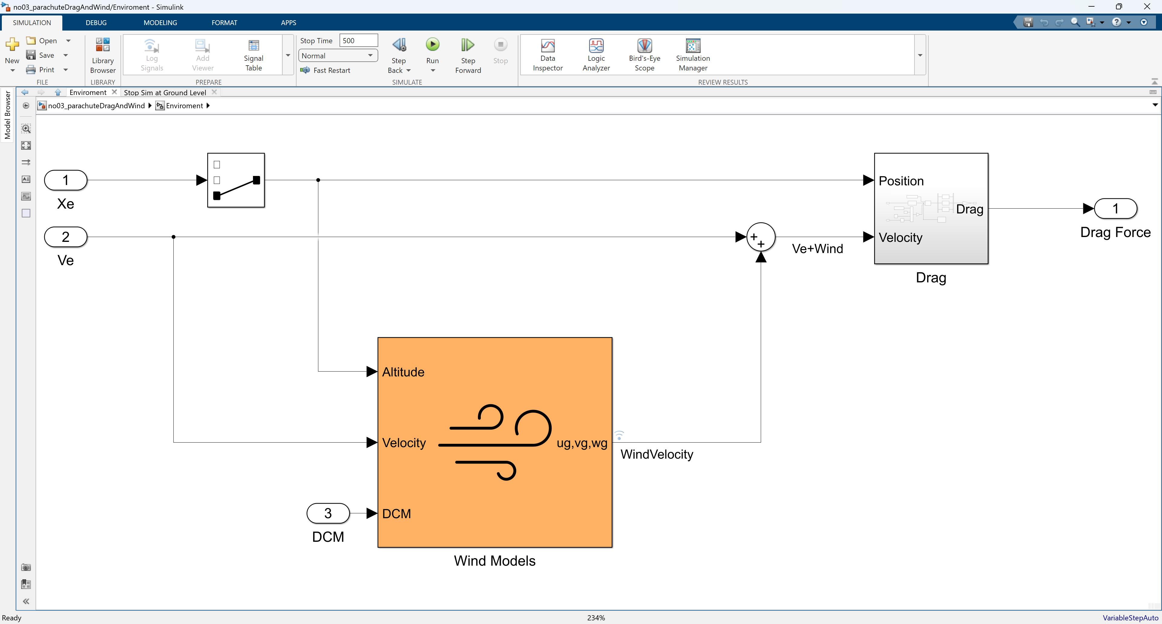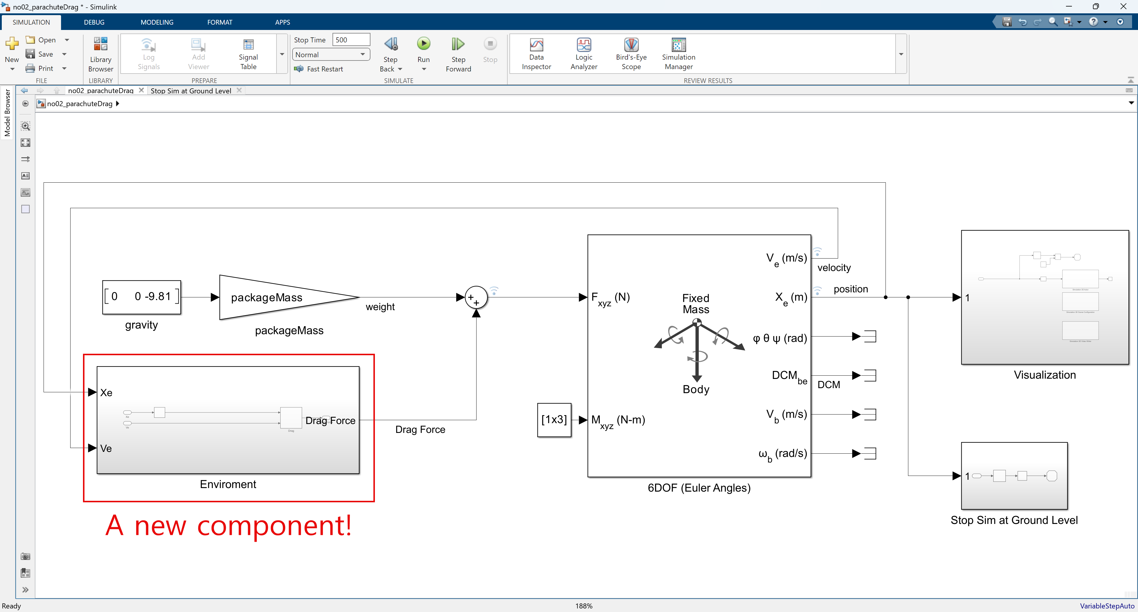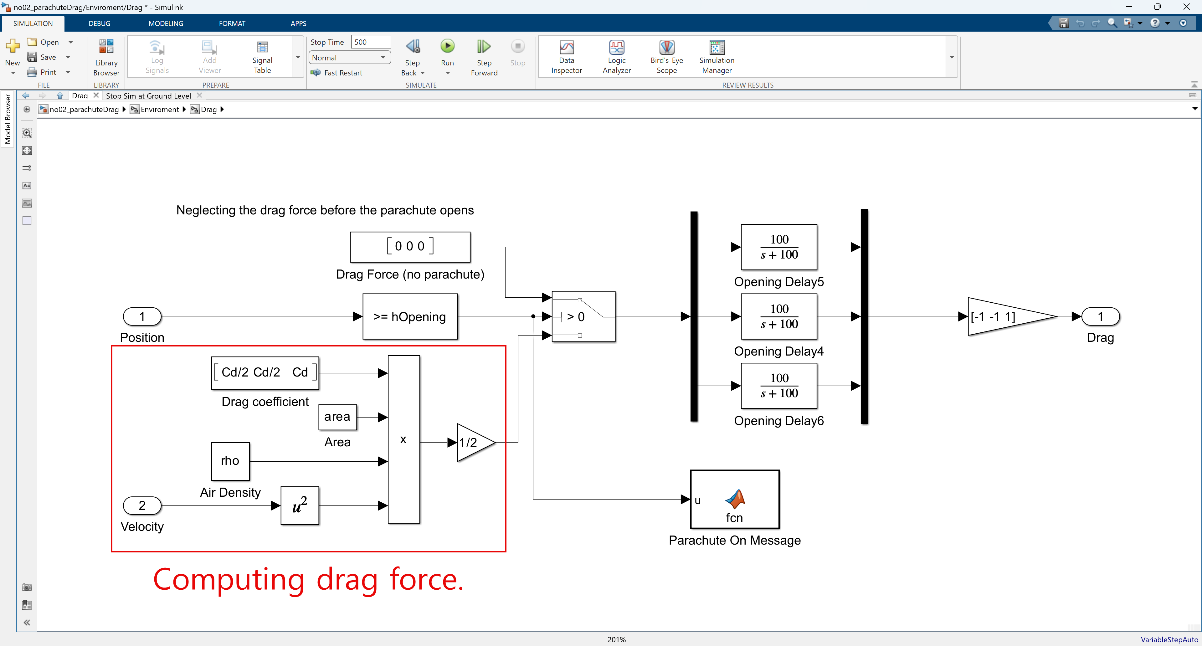 워크샵 자료의 no02_parachuteDrag.slx 파일을 열어보면 아래와 같이 모델링되어 있는 것을 알 수 있다.