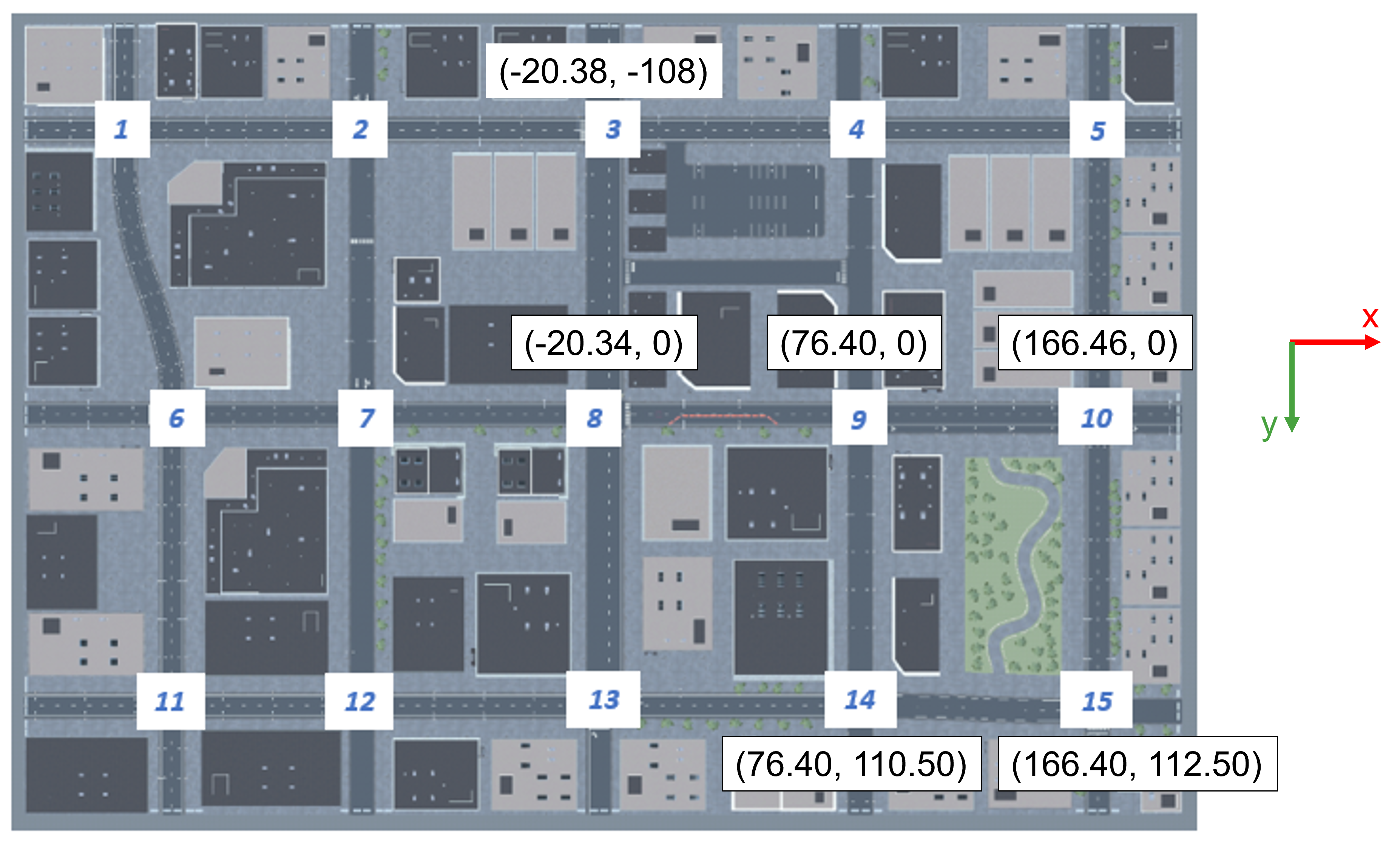 이제, 낙하산이 없을 때와 낙하산을 100m 상공에서 펼칠 때를 3D 시각화할 수도 있다. 시각화는 매스웍스에서 제공하는 US City Scene에서 진행하였다. 이 Scene의 지도는 아래와 같으며 지도의 9번 교차로 (좌표: 76.40, 0)에서 물체를 사출하였다. x, y 방향으로 모두 10m/s으로 날고 있었으니 9번 교차로에서 15번 교차로로 낙하하게 된다.