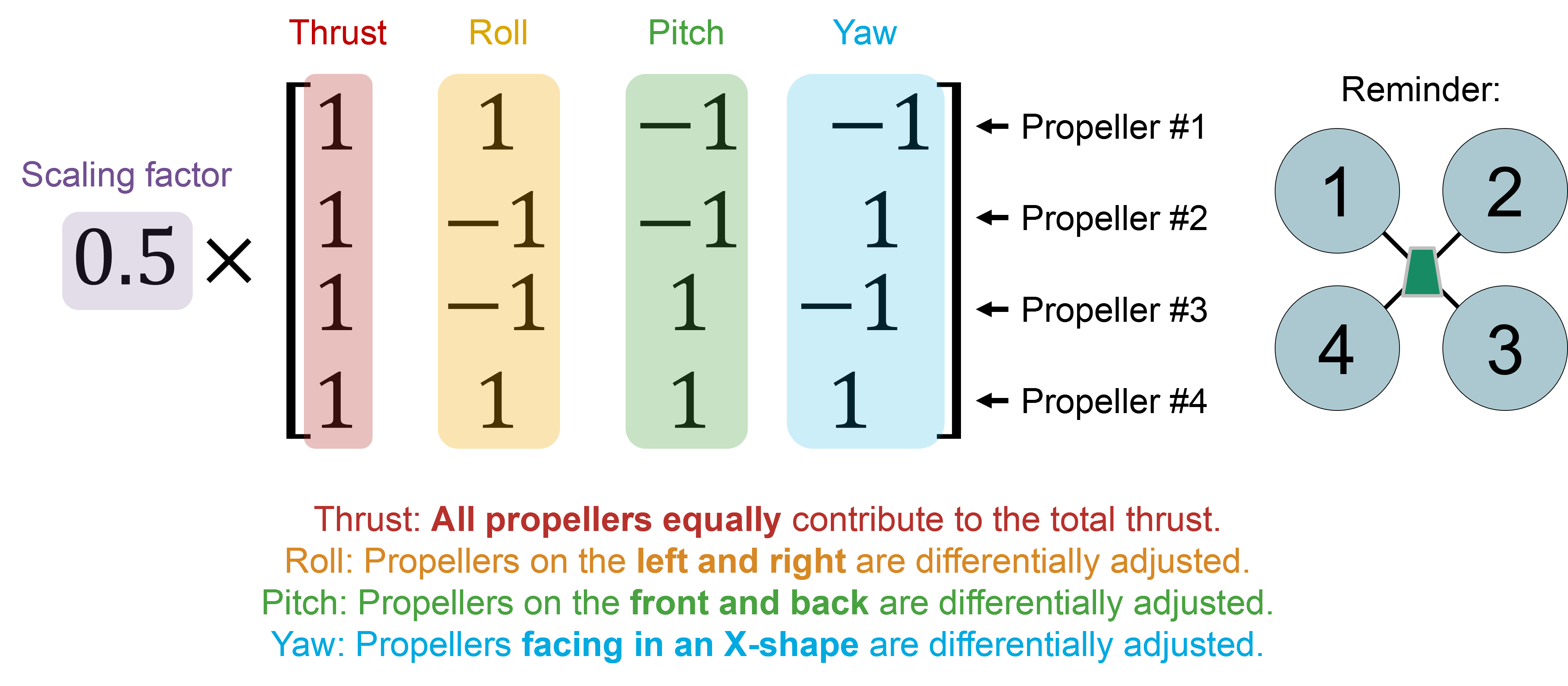행렬의 각 열은 제어 입력에 대응하고, 각 행은 4개의 프로펠러에 대응한다. 표준적인 쿼드콥터 (X-형태 배치)의 물리적 특성과 각 프로펠러의 회전 방향을 고려하여 설계된다.