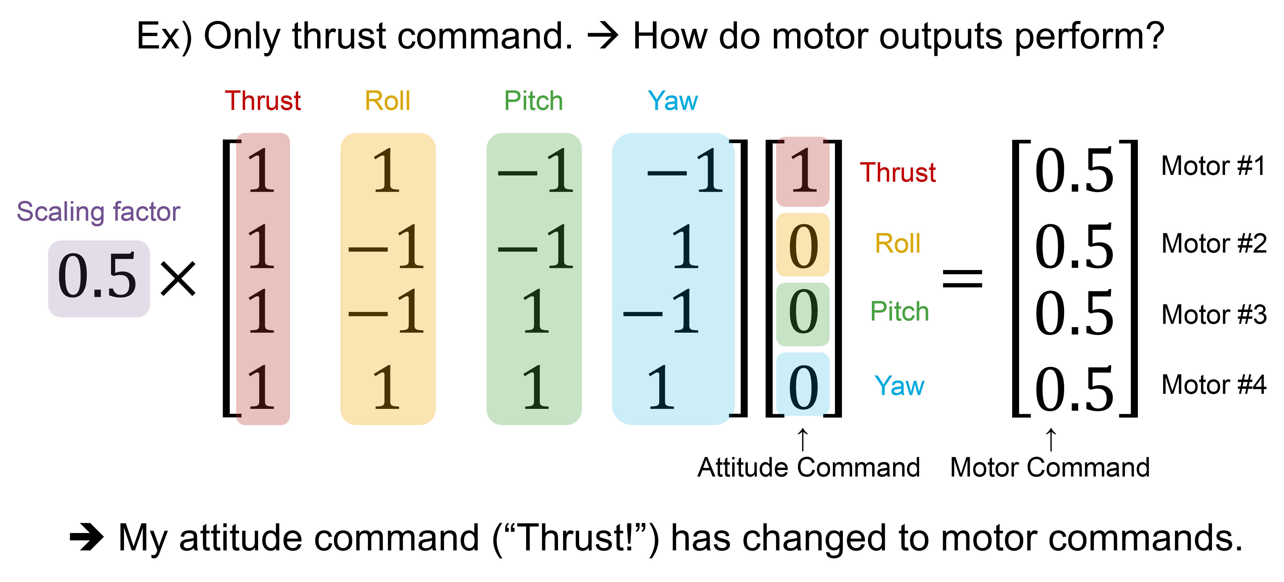 행렬 앞의 0.5와 같은 스케일링 계수는 전체적인 스케일링 계수이며, 입력 명령의 범위나 물리적 계수(프로펠러 효율, 모터 특성 등)에 맞춰 값을 조정하는 역할을 한다.