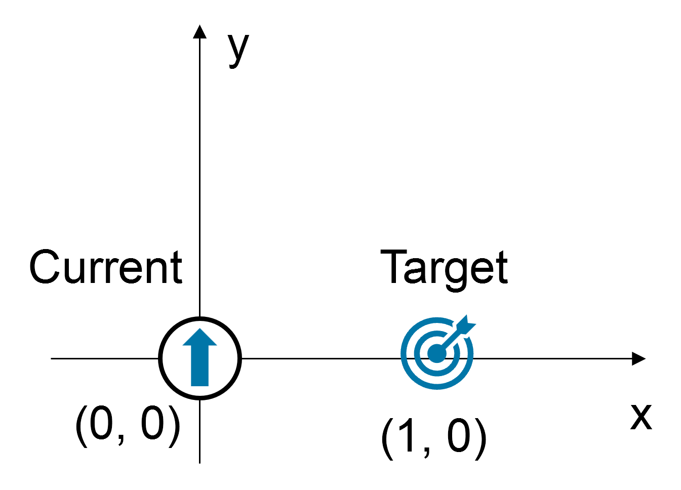 예제 1. 현재 위치 (0, 0), 목표 위치 (1, 0), 현재 Yaw = 0도