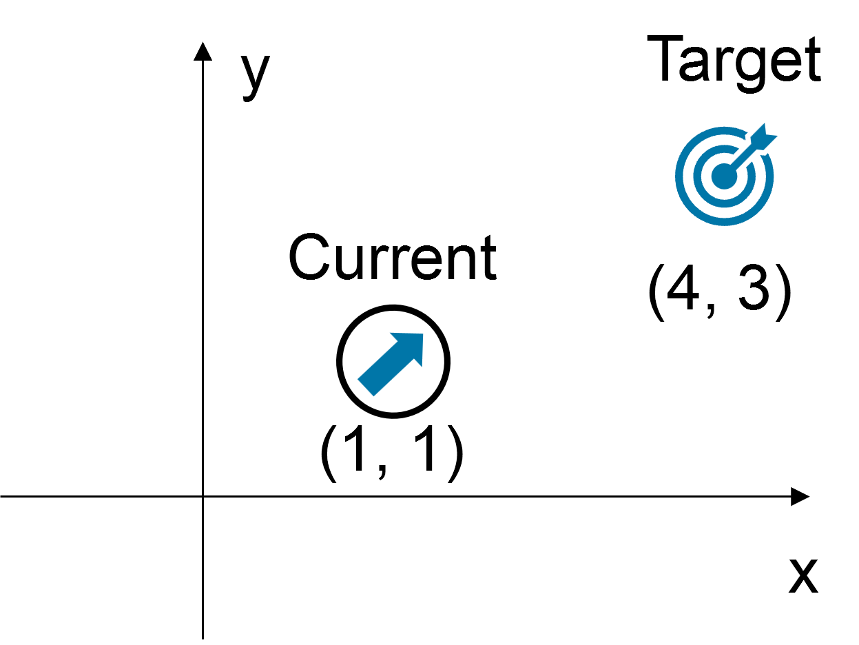 위 그림과 같은 상황에서 현재 위치와 목표 위치의 차이 벡터를 구하면 아래와 같다. 참고로 우리는 드론의 등이 아니라 바닥을 보고 있는 상황이다.